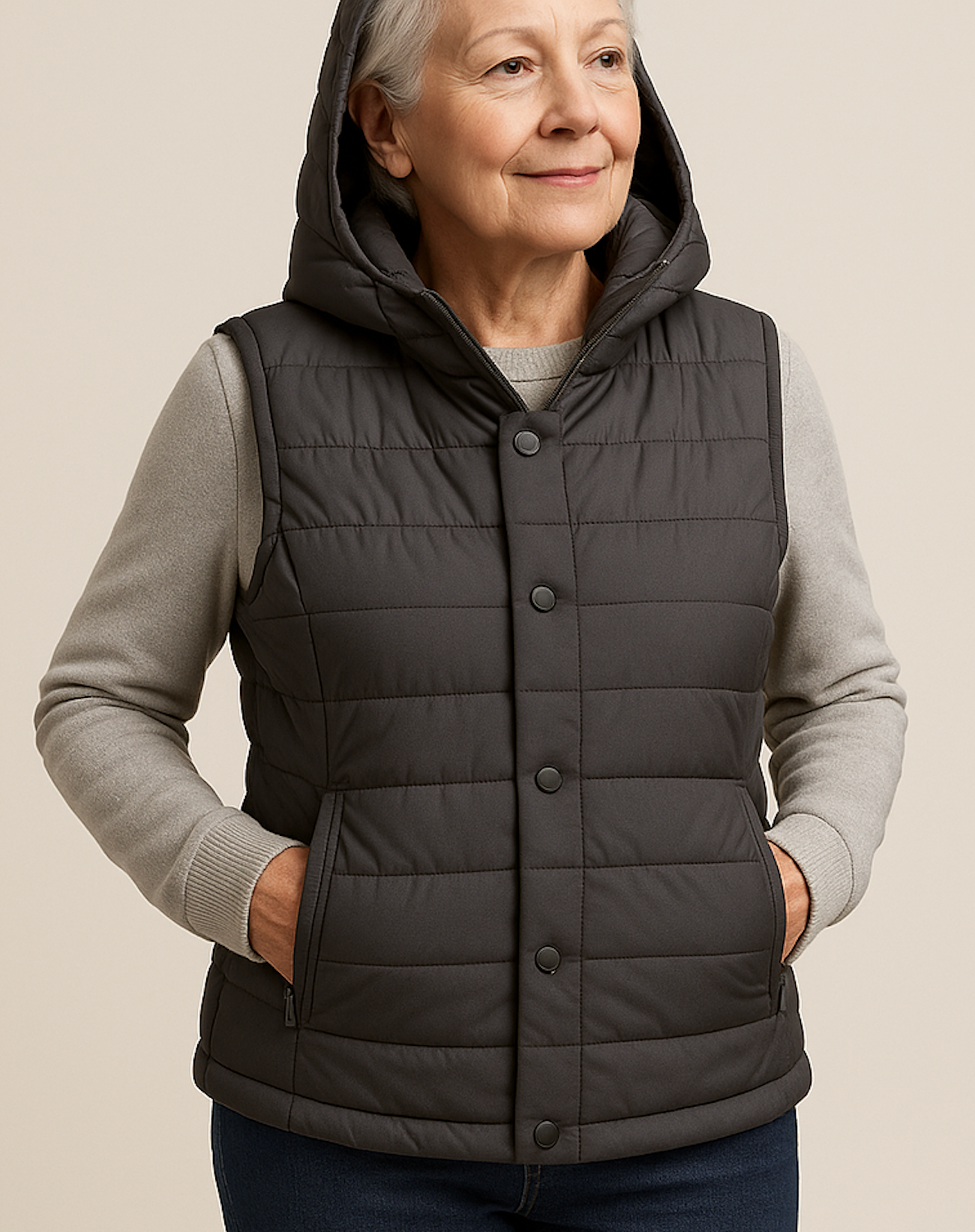 ThermaEase vesta byla vytvořena pro seniory, kteří chtějí zůstat v teple i během chladných dnů – bez kompromisů v pohodlí. Její lehká, prošívaná konstrukce zadržuje teplo, ale zároveň zůstává prodyšná, takže se v ní nikdy nepřehřejete. Magnetické zapínání nahrazuje klasický zip a umožňuje snadné oblékání i při omezené hybnosti prstů. Vesta má odnímatelnou kapuci pro extra ochranu proti větru a dešti a dvě hluboké kapsy na zip pro bezpečné uložení klíčů nebo telefonu. Měkká vnitřní podšívka dodává pocit útulného tepla, zatímco střih je navržen tak, aby lichotil postavě a zároveň umožňoval volný pohyb. ThermaEase spojuje styl, praktičnost a chytré detaily, které z ní dělají ideální zimní kousek pro každý den.